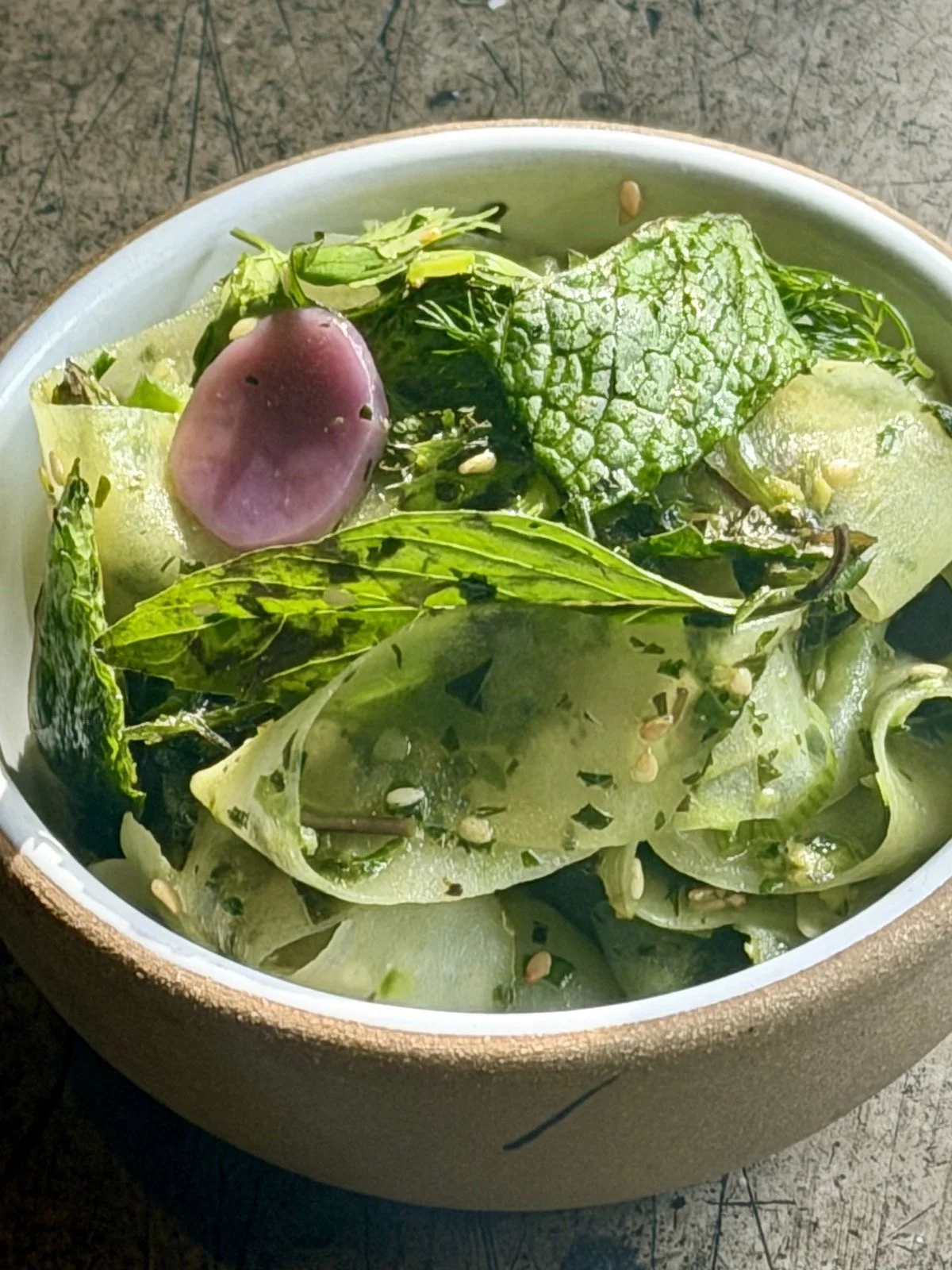 Again, not a vegetable many people associate with Spring, but potatoes are always best at this time of year and we’re using them to make a variation on the Chinese longevity noodle. We slice one wide strip of potato into a long noodle and quickly stir fry it in vinegar and sesame oil leaving it crunchy, then we toss it with a spring pesto made of every single herb you can imagine (basil, Thai basil, mint, cilantro, parsley, cilantro, dill, chervil...). It's a blast of Springtime serotonin for your taste buds. And it’s spiked with some pickled baby rainbow potatoes for extra little blasts of flavor.