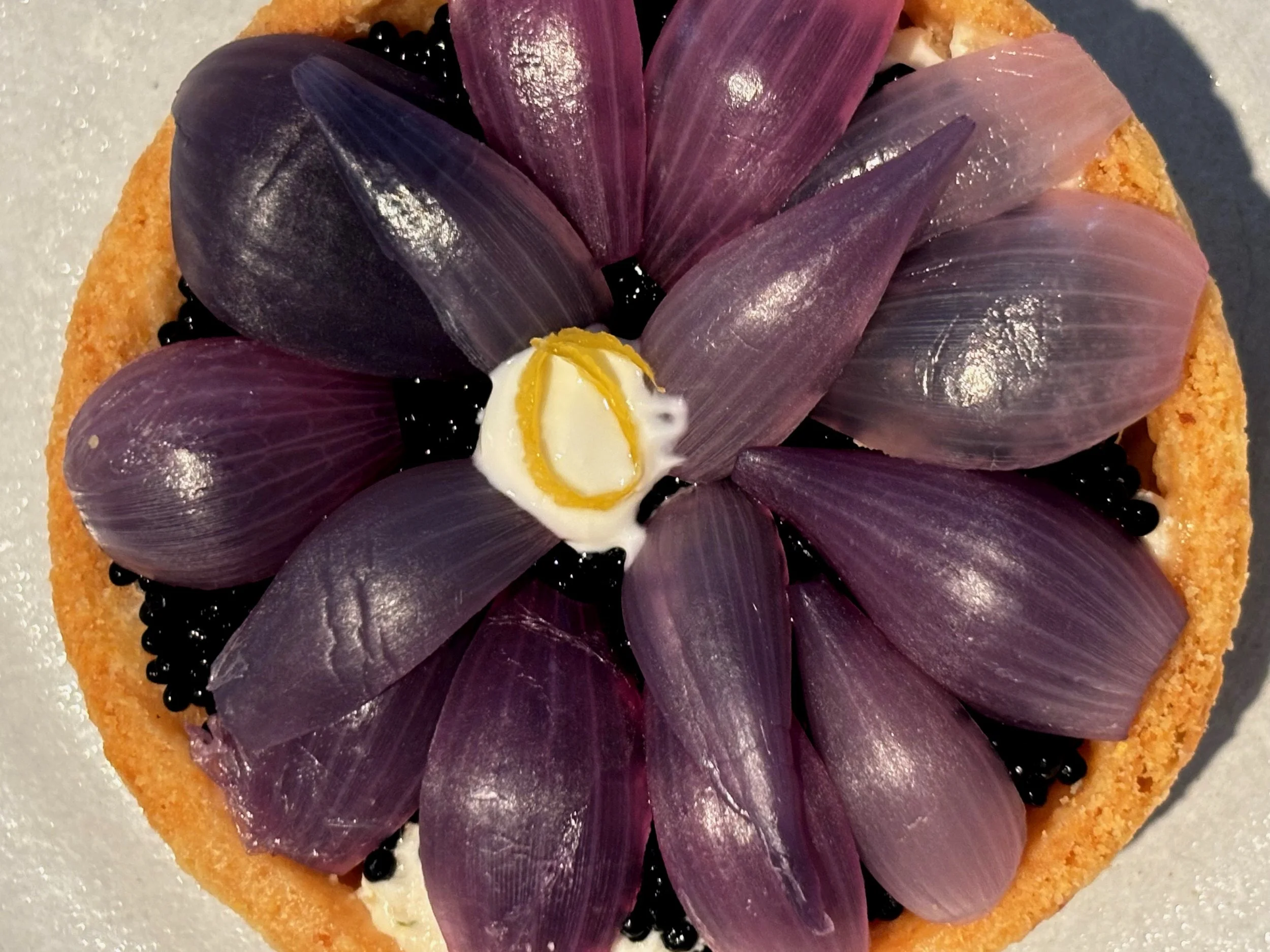 onion tart, pearl onion petals, onion cream, seaweed caviar